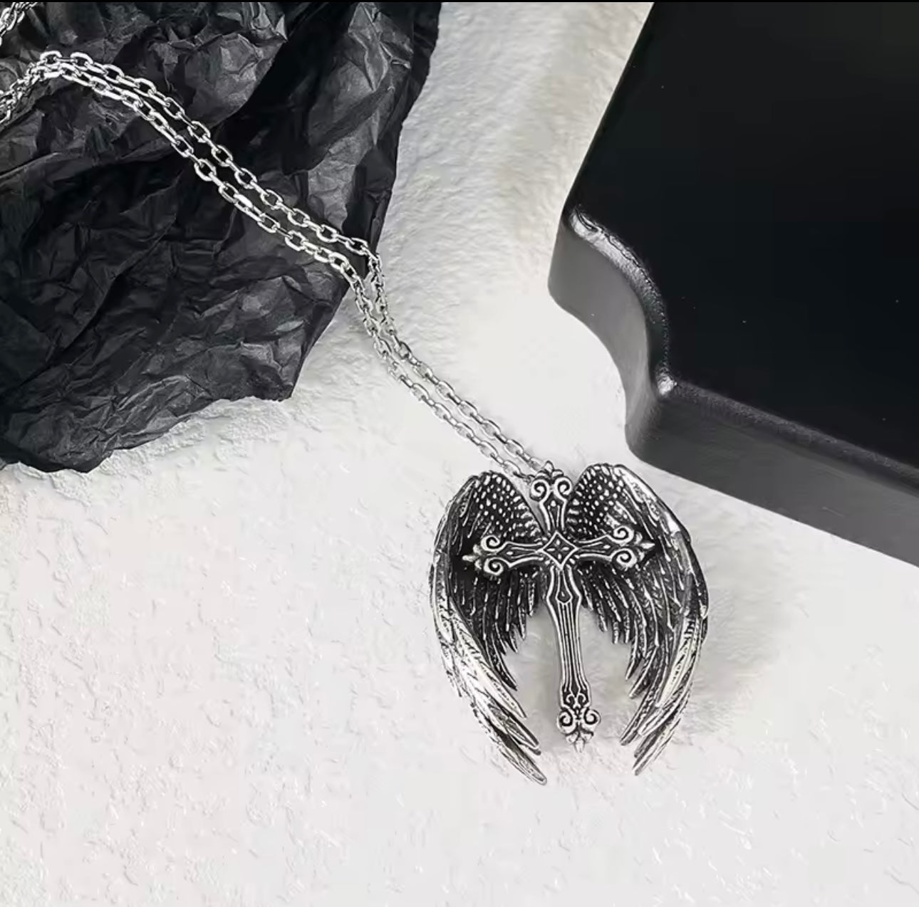 Let this Silver Cross Necklace with Angel Wings be a constant reminder of faith, love, and divine protection.